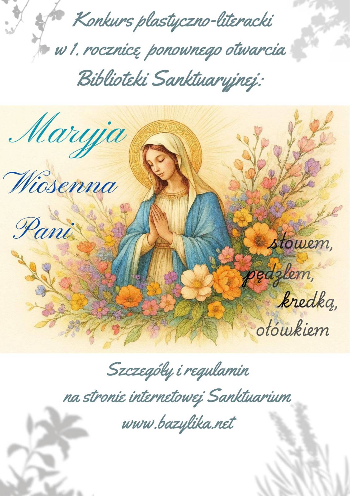 Biblioteka Sanktuaryjna przy Sanktuarium Matki Bożej Chełmskiej zaprasza do udziału w nowym konkursie plastyczno-literackim pod hasłem „Maryja Wiosenna Pani – słowem, pędzlem, kredką, ołówkiem”. Jego celem jest przybliżenie postaci Maryi jako Tej, która przynosi wiosnę w życie człowieka - nadzieję, odnowę i piękno - oraz zachęcenie do twórczej refleksji nad Jej obecnością w codzienności.